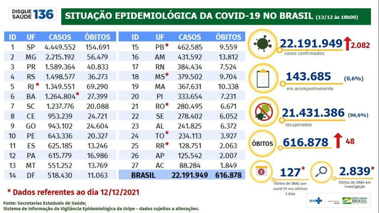 O Ministério da Saúde divulgou ontem (13) novos números sobre a pandemia de covid-19 no país. De acordo com levantamento diário feito pela pasta, o Brasil tem acumulado 22,1 milhões de casos confirmados da doença e 616,8 mil mortes registradas. Os casos de recuperados somam 21,4 milhões (96,6% dos casos).