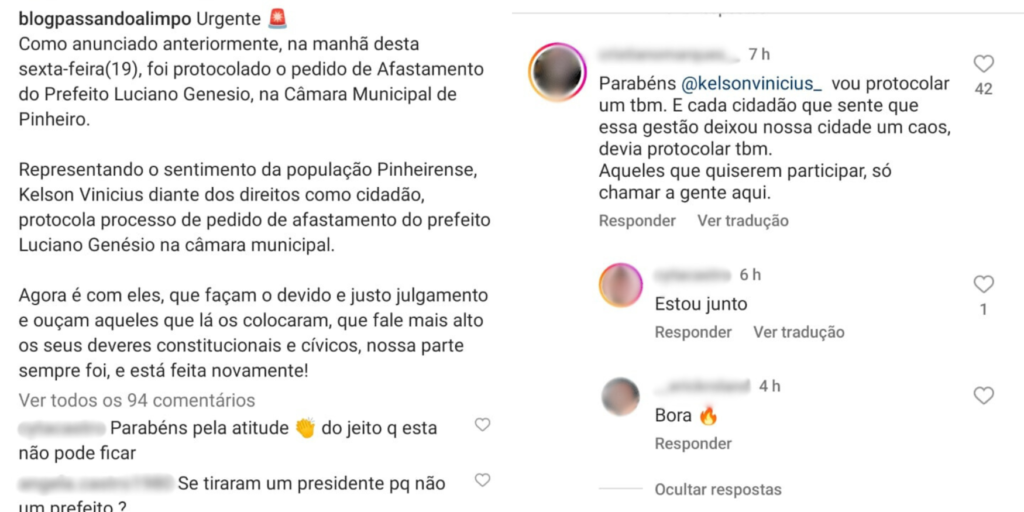 O blogueiro que também é candidato a vereador, tem recebido grande apoio da população nas redes sociais pelo seu posicionamento, alguns afirmam se juntar a causa, indo protocolar também seus pedidos de cassação contra o prefeito, pedem que a justiça seja feita e que Pinheiro volte a ser a Princesa da Baixada.