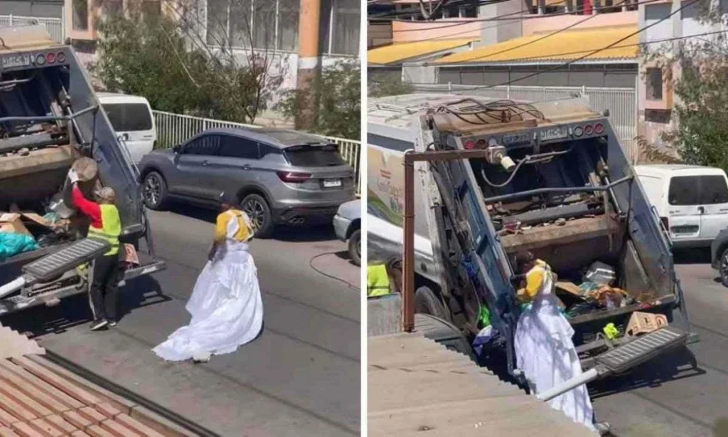 Uma dupla de garis viralizou nas redes sociais ao usar um vestido de noiva durante o trabalho. A cena foi flagrada na cidade de Antofagasta, no norte do Chile, e vem divertindo a web.
