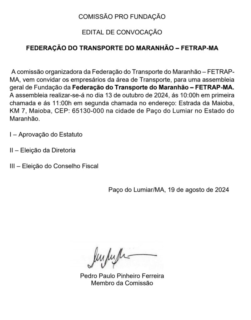 • Edital de Convocação Federação do Transporte do Maranhão (FETRAP-MA).
