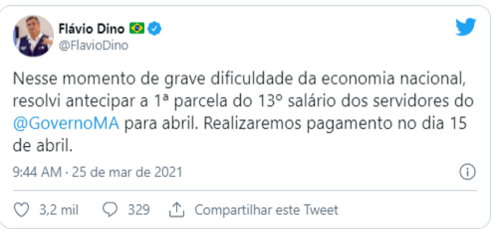 O governador do Maranhão, Flávio Dino, anunciou nesta quinta-feira (25), por meio de suas redes sociais, que vai antecipar a primeira parcela do 13º salário para os funcionários públicos estaduais. A previsão para o pagamento é no dia 15 de abril.
