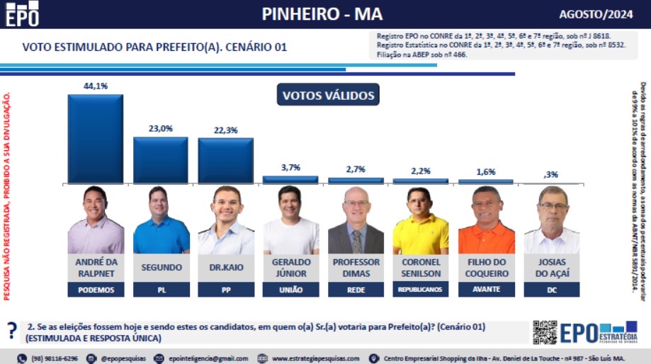 O levantamento do Instituto EPO mostra também o cenário considerando apenas os votos válidos. Neste panorama, André da Ralpnet amplia a vantagem e aparece com 44,1%, seguido por João Batista Segundo com 23% e Dr. Kaio tem 22,3%.