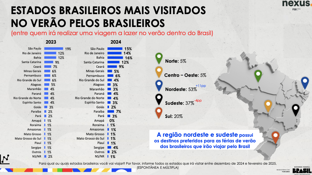 As informações são da pesquisa inédita Tendências de Turismo Verão 2025 – comportamento da população brasileira, feita pelo Ministério do Turismo (MTur) e pela Nexus – Pesquisa e Inteligência de Dados.