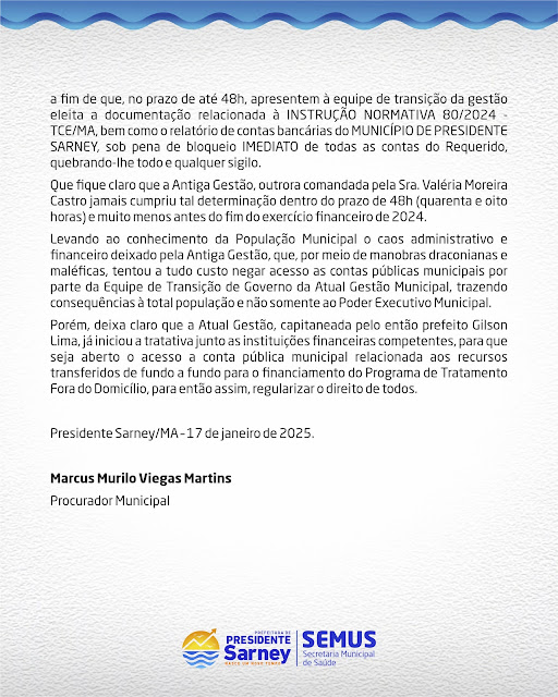 Prefeitura se Presidente Sarney emite nota de esclarecimento referente a nota de repúdio que circula em redes sociais sob a suposta negativa de atendimento ou transferência de recursos correspondete ao Programa de Tratamento de Saúde fora do Domicílio.