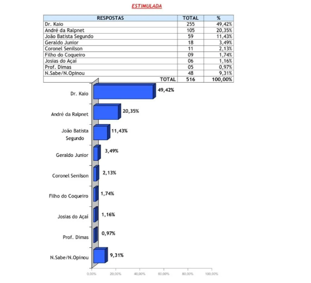 No cenário estimulado, quando os entrevistados têm acesso a nomes dos pré-candidatos, André da Ralpnet aparece em primeiro lugar com 48,06%. Em segundo lugar aparece João Batista Segundo, com 26,74%; Dr. Kaio, tem 15,31%; Professor Dimas, aparece com 0,97%; Coronel Senilson tem 0,58%; Geraldo Júnior 0,58%; Filho do Coqueiro, tem 0,39%; e Josias do Açaí não pontuou. 2,33% dos entrevistados disse não votar em nenhum dos nomes apresentados. Não souberam ou não quiseram responder são 5,04%