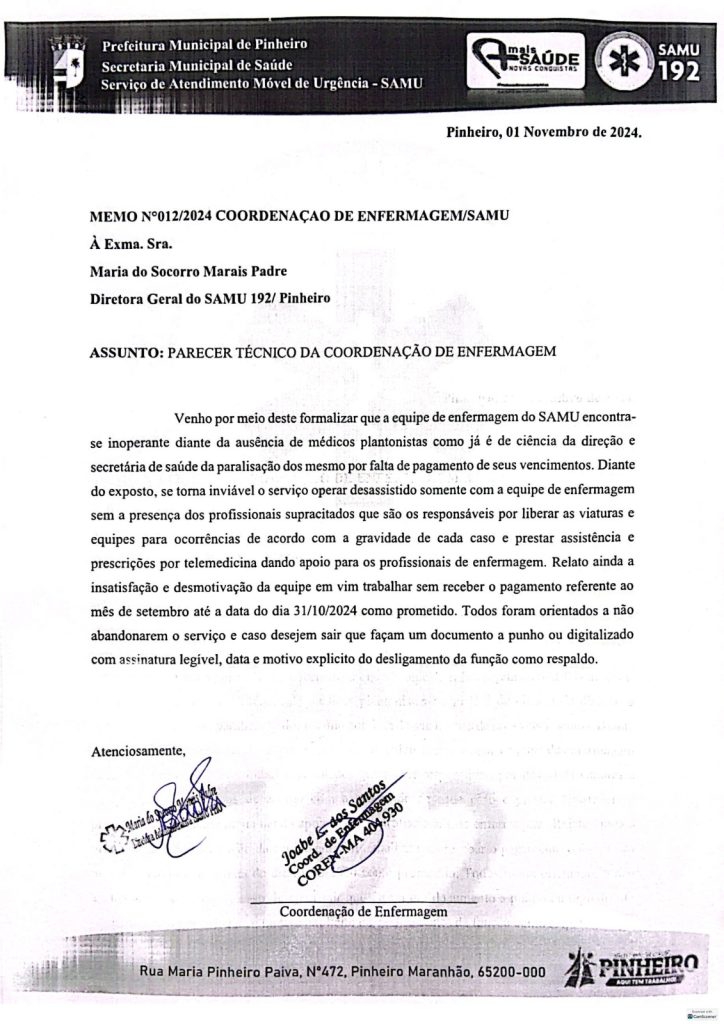 A cidade de Pinheiro, no Maranhão, enfrenta um colapso nos serviços do SAMU (Serviço de Atendimento Móvel de Urgência), devido a uma série de dificuldades enfrentadas pelos profissionais o que levou a Coordenação de Enfermagem do SAMU encaminhar um ofício para a Coordenação Geral do SAMU, comunicando também a sua paralisação. De acordo com informações, a equipe de médicos, enfermeiros e outros colaboradores não está recebendo seus pagamentos, situação que levou à paralisação dos serviços de urgência e emergência, essenciais para a população. Considerando que o SAMU é um serviço coordenado pela equipe médica, e como os médicos realizaram a paralisação por falta de pagamento dos seus honorários, dos seus plantões, os enfermeiros também decidiram parar.