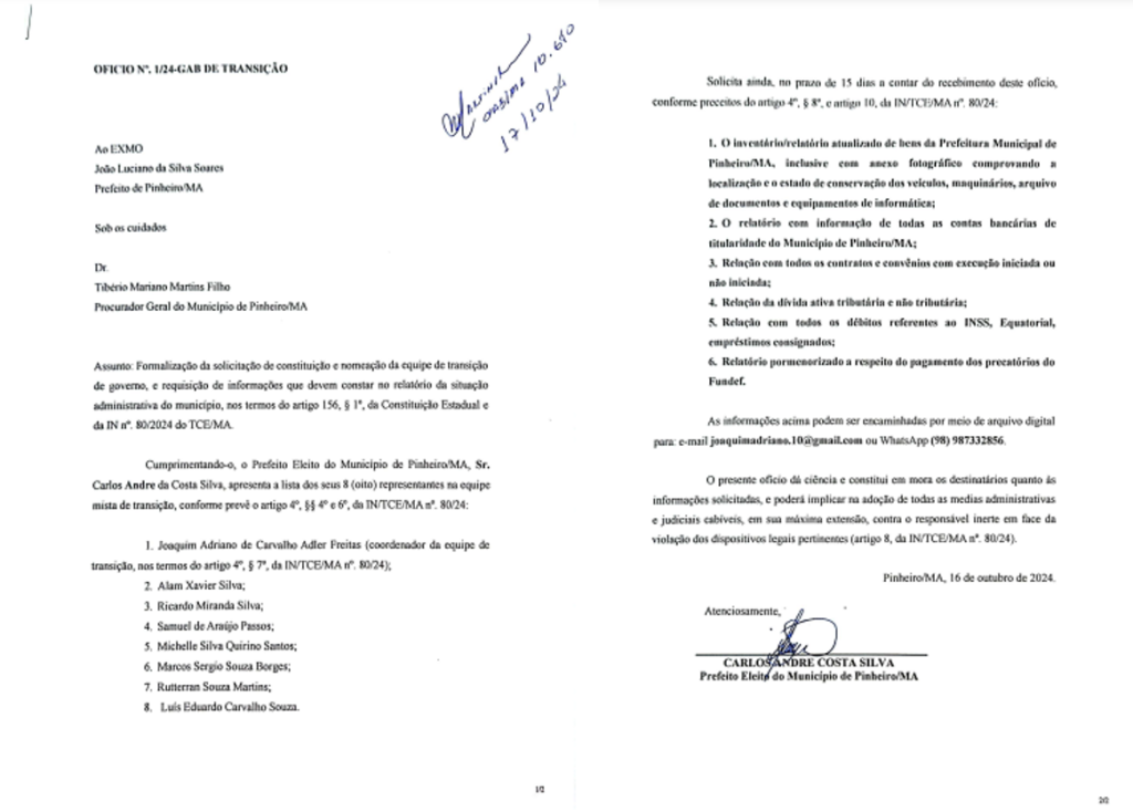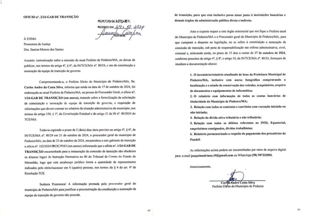 O prefeito eleito enfatizou que, apesar dos obstáculos, mantém seu compromisso com a população de Pinheiro e segue tomando as providências necessárias para iniciar seu mandato com total clareza sobre a real situação do município. André reforçou sua determinação em buscar um processo de transição ordenado e legal, sempre priorizando o interesse público. Essas informações são cruciais para que a equipe de André possa se inteirar da real situação financeira, patrimonial e organizacional da prefeitura, assegurando que a transição ocorra de forma ordenada e transparente.